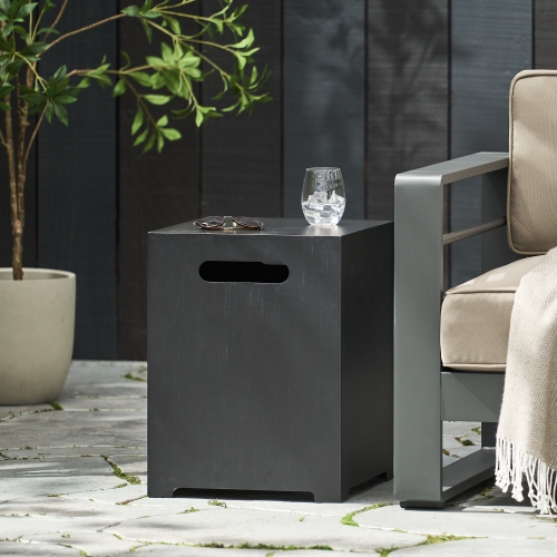 Keep your propane tank safe and stylish with this square metal tank cover and side table. Featuring a durable powder-coated iron frame, built-in tank storage, and no assembly required, it’s perfect for patios, decks, or outdoor entertaining. Adds convenience, safety, and modern design to any outdoor space.