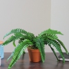Green artificial Boston fern potted tabletop plant. Features realistic leaves with a jagged edge design. Shape the fern with the wire branches