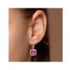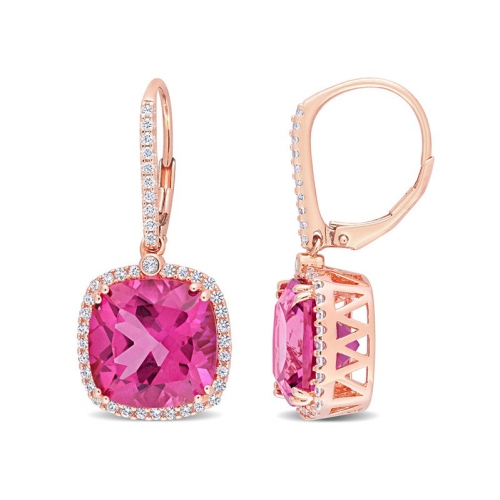These charming pink topaz and white sapphire earrings are crafted in lustrous rose plated sterling silver and feature cushion-cut checkerboard, prong-set pink topaz gemstones with 84 round-cut, bezel and buttercup-set white sapphire stones in a classic halo leverback design. Coordinate these earrings with any ensemble and instantly add a touch of color and sophistication to your look. A perfect ch