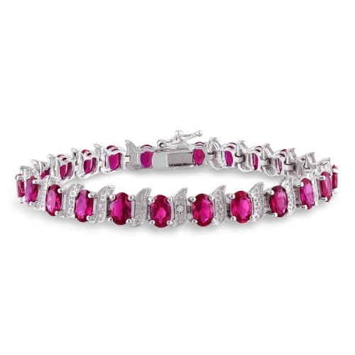 Crafted in polished sterling silver, this attractive lab-Created Ruby and Diamond Accent Bracelet sparkles with 24 vibrant, prong set created rubies. Three twinkling round diamonds accent this gemstone bracelet, which measures 7 inches in length and is secured with a pressure tongue clasp.