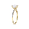 This glistening moissanite engagement ring is crafted in 14-karat yellow gold and features a cushion-cut, prong-set created white moissanite at its center with 22 round-cut, prong-set diamonds adding shimmer along its delicate band. With exquisite luster and incredible shine, choose this style for your bride-to-be as you celebrate this special milestone and begin the next stage of your lives toget