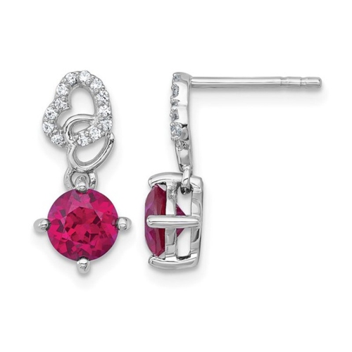 A truly classic pair of ruby earrings the birthstone for the month of July. Each earring is crafted from sleek sterling silver with rond drop shaped lab-created rubies 2.00 carats (ctw) as they dangle gently below a heart shaped silouette including sparkling round synthetic cubic zirconias. These ruby earrings are 3/4 inch in length and 1/3 inch in width.