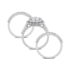 This moissanite halo flower bridal ring set is crafted in lustrous sterling silver and features three distinctive rings crafted to combined perfection. The floral engagement ring features a round-cut created white moissanite gemstone as the center stone with round-cut created white moissanites arranged in a double halo and along the band. The other two stackable wedding bands features created whit