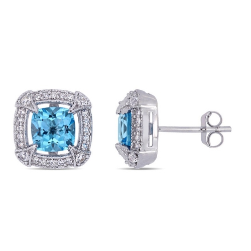 These modern Swiss blue topaz and white sapphire with diamonds stud halo earrings are crafted in 10-karat white gold and feature cushion cut Swiss blue topaz stones as their centerpieces, paired with a total of eight round pave set white sapphires and 40 round pave set diamonds in a stunning floating square halo design. Instantly add a touch of color, elegance and sophistication to any ensemble wi