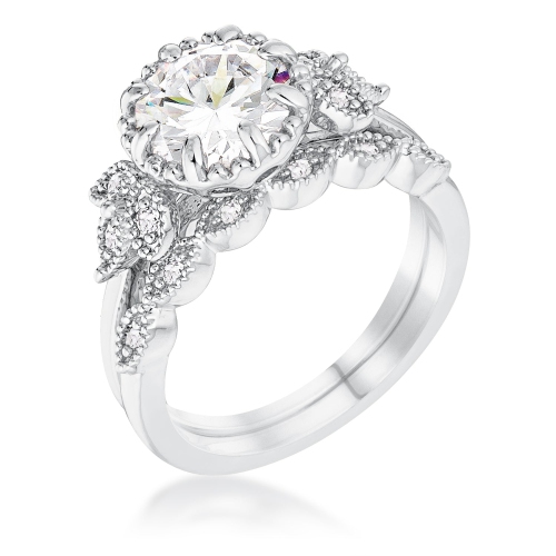 2.25Ct Rhodium Plated Round Cut CZ Trio Laurel Leaf Engagement Set