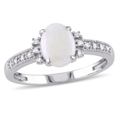 This magnificent ring features an oval cabochon opal center stone adorned with round white accent diamond side stones. This extraordinary ring is set in 10-karat white gold and is enhanced with a miligrain finish. Opal is the birthstone for the month of October.