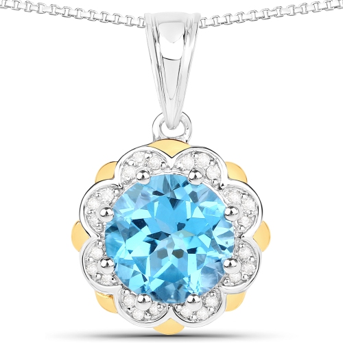 2.32 Carat Genuine Swiss Blue Topaz & White Diamond 14K Yellow Gold with .925 Silver Pendant