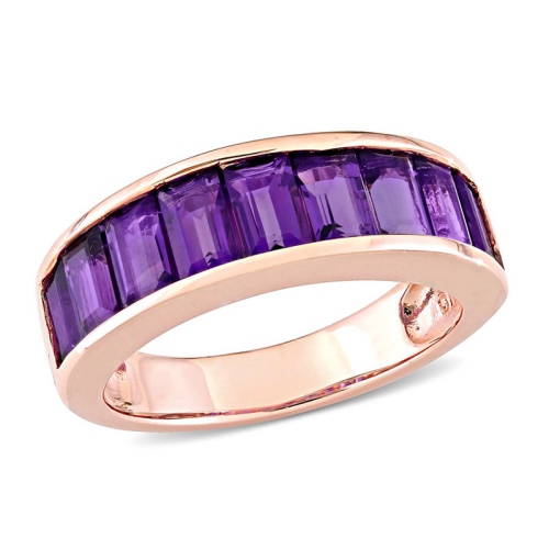 Surprise your loved one with this striking African amethyst anniversary ring. Crafted in lustrous rose gold flash plated sterling silver, this versatile ring features nine baguette channel-set African amethyst gemstones (5x3mm). Enhanced with a polished finish. Purple amethyst is the featured birthstone for the month of February.