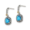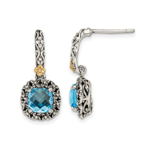Beautiful natural cushion checkerboard cut blue topaz gems dangle from the embrace of polished rhodium plated antiqued sterling silver with yellow accents the include a floral inspired design around the blue gems, featuring the birthstone for the month of December. These dangle earrings are 7/8 inch in length and 2/5 inches in width.