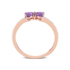 Add some shine to your outfit with this purple amethyst and diamond two Sstone heart ring. Crafted in lustrous 10 karat rose gold, it features two heart cut amethyst gemstones (4x4mm) with 20 round pave set diamonds (H-I, I2-I3) studded on its band. Polished to a brilliant shine. Purple Amethyst is the birthstone of February.