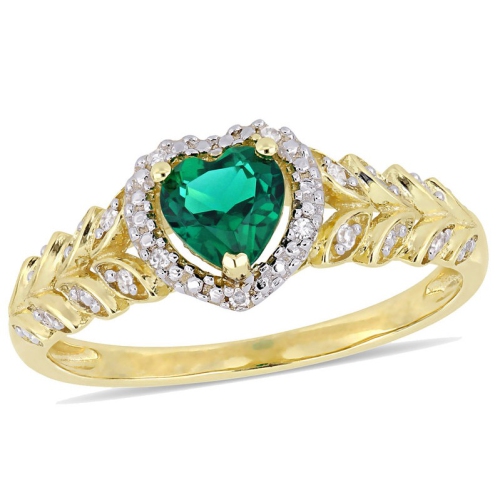 This shimmering halo heart promise heart ring is crafted in gleaming 10-karat yellow gold and features twinkling diamonds and a 2/5 carat (ctw) lab created emerald in a beautiful heart design. Enhanced with a brilliant finish this engagement ring is sure to make your wife look stunning on Valentines Day. Pair this ring with any ensemble for an elegant and polished look.