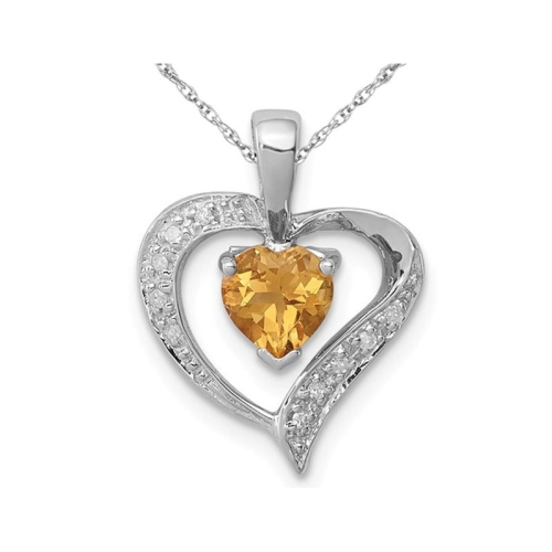 A beautiful sleek rhodium plated sterling silver heart pendant featuring a yellow sunny citrine gemstone the featured birthstone of November. This item includes a matching 18 inch silver chain.