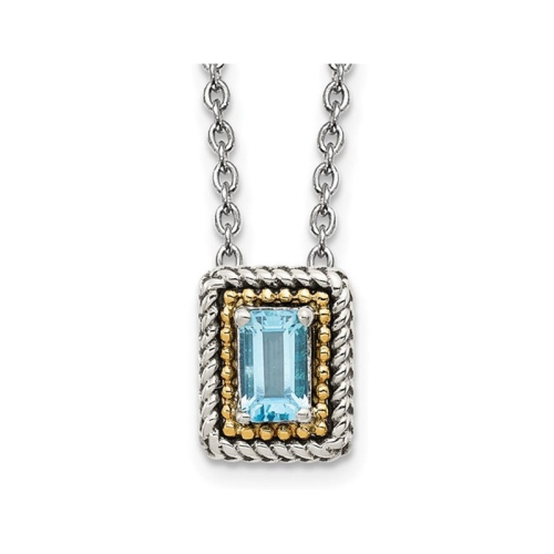 One emerald-cut rectangular 2/5 carat (ctw) swiss blue topaz gemstone is prong-set in antiqued cable sterling silver and highlighted but 14 karat gold accents. This gallery backed pendant is suspended from a an 18 inch silver chain included.