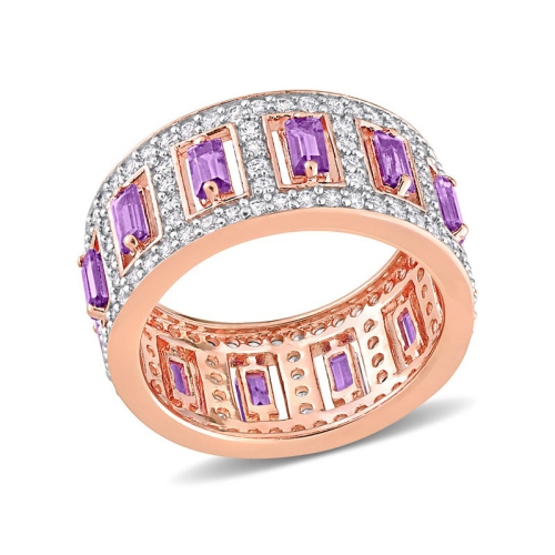 This exceptional eternity ring is mounted in lustrous rose plated sterling silver. This impeccable ring showcases 12 baguette cut, prong-set African amethyst gemstones and 140 round cut, pave set white topaz gemstones. Polished to a brilliant shine. Amethyst is the featured birthstone of February.