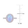 Add a breathtaking piece to your collection with this exceptional halo ring. Crafted in lustrous pink rose gold, this delicate ring features an oval-cut, prong set Ethiopian blue opal encased by 30 round, buttercup set lab-created white sapphire gemstones in a halo design. Enhanced with a polished finish, this ring is a perfect accessory for a dressy occasion. Opal is the birthstone for the month