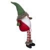 Red and green sitting tabletop gnome Christmas decoration. Hat and boots are trimmed with faux beige and gray fur. Dangling striped legs with glitter