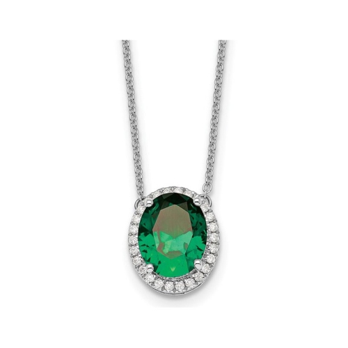 A beautiful solitaire oval shaped natural 10x8mm lab-created green emerald gemstone is set in striking crisp 14 karat white gold and surrounded by a halo of sparkling white diamonds 1/6 carat (ctw) and includes a matching 18 inch 14 karat white gold chain. Green emeralds are the birthstone for the month of May.