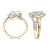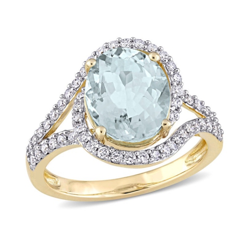 This stunning crossover aquamarine ring is crafted in 14-karat yellow gold and features a sparkling oval-cut aquamarine 3.20 carats (ctw) in a unique diamond studded halo split shank design. Give yourself a glamorous look with this trendsetting ring featuring the March birthstone in all its glory and a 1/2 carat (ctw) of sparkling diamonds.