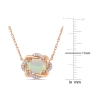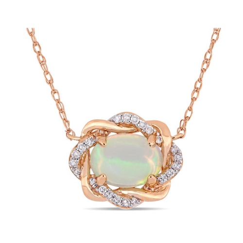 This trendsetting blue Ethiopian opal and diamond necklace is carefully crafted in 10-karat rose pink gold and features a stunning oval cabochon blue Ethiopian opal at its center surrounded by 22 round cut, prong set acccent diamonds in a gorgeous horizontal interlaced halo design. Add a touch of elegance, sophistication and style to any ensemble with this stunning gemstone and diamond necklace. O