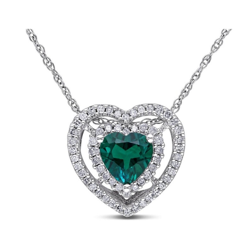 This stylish necklace features a heart cut lab-created green emerald stone 3/4 carat (ctw) surrounded by round white diamonds 1/5 carat (ctw) set in gleaming 10-karat white gold. This dazzling pendant is hung on a rope chain and is secured with a spring ring clasp. Green emerald is the birthstone for the month of May.