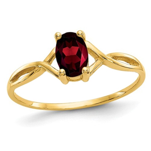 A solitaire rich red oval garnet is set in shimmering 14 karat yellow gold in this unique and beautiful ring featuring the birthstone of January.