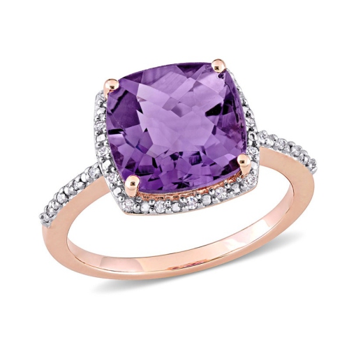 This amethyst and diamond accent halo ring is a breath-taking piece that will give you a captivating look. Mounted in glistening 10 karat pink rose gold, this feminine ring has a cushion-but amethyst gemstone (10x10mm) in the center with 24 round white diamond accents 1/10 carat (ctw H-I, I2-I3) in the halo covering the crown. This halo gold ring features the February birthstone.