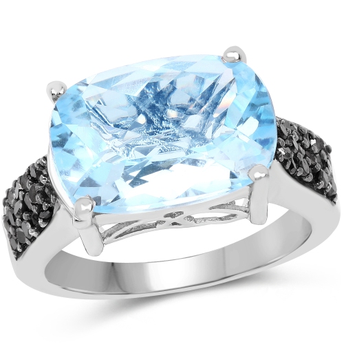3.96 Carat Genuine Baby Swiss Blue Topaz and Black Diamond .925 Sterling Silver Ring