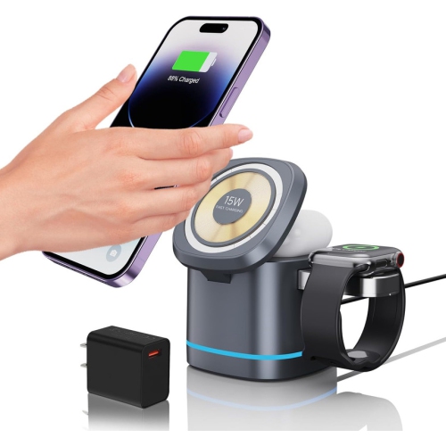 3 in 1 Wireless Charging Station, 15W Fast Charging Wireless Charger Cube Stand, Magnetic Travel Charger (Black)