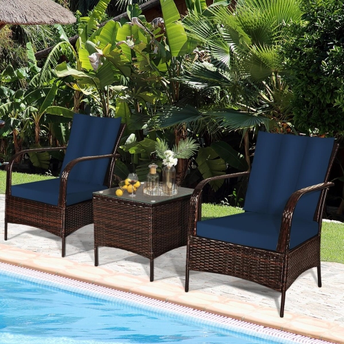 This 3 Pcs patio rattan bistro set can make your outdoor living become better. Made of weather-resistant rattan and sturdy steel materials, the chair is stable enough to hold around 360 Ibs weight.