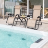 The cool and breathable fabric keeps you away from sultry feeling even during summer days. The waterproof and sun resistant performance makes it the best possible furniture set for outdoors. Made of a solid steel frame, both lounge chairs and tables can be used for a long time. The adjustable design with a locking system is a plus for enhanced comfort. All in all, it takes advantage of the body's gravity to generate comfort and relaxation. Isn’t that amazing? Widened armrest and soft head pillow provide yet another level of comfort and support to your whole body. The practical folding table in this set lets you place drinks and snacks on it and 2 mesh cup holders prevent any spilling disaster. Most importantly, this patio lounge chair set is light in weight and foldable but sturdy enough to support a high load. Last but not the least, it's easy to store and move from one place to the other.