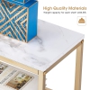 This contemporary console table with nordic style makes a perfect addition to your home; gold metal contrasts with beige white faux marble, creating a simple and elegant look. Display your favorite books, magazines, and decorative items on the tempered top and utilize the three open shelves for additional storage. The sleek, industrial design of this sofa table will keep your home or office in a tidy condition, making it the perfect addition to any space.