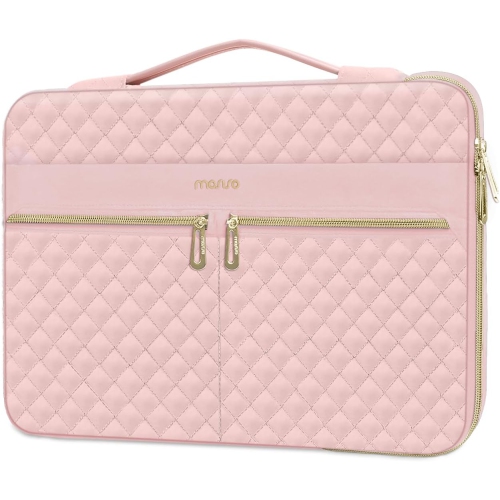 360 Protective Laptop Sleeve Compatible with MacBook Air/Pro, 13-13.3 inch Notebook, Compatible with MacBook Pro 14 inch, Square Quilted Side Open Bag with 3 Pockets&Handle&Belt,Pink