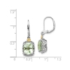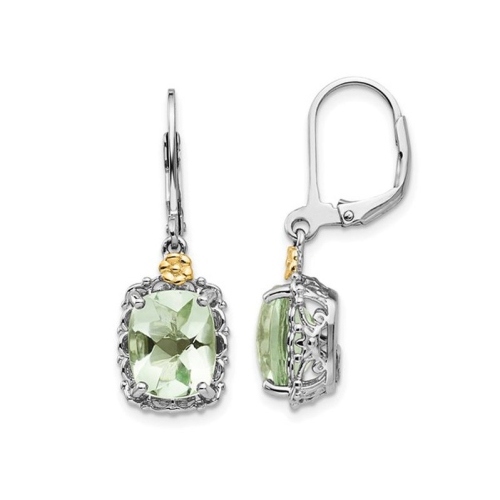 Two cushion-cut 10x8 natural green quartz gemstones are prong set in polished rhodium plated sterling silver with yellow gold accents in these dangle drop earrings which gleam and glow.