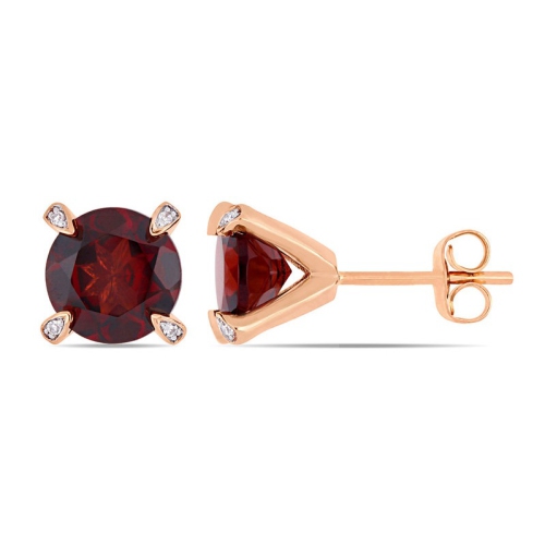 These classic garnet and diamond martini stud earrings are crafted in 10-karat rose gold and feature round cut garnet stones and diamond studded prongs in a modern and simple solitaire stud design. These gemstone earrings are a perfect way to add a touch of color and elegance to any ensemble, from business casual to formal wear.