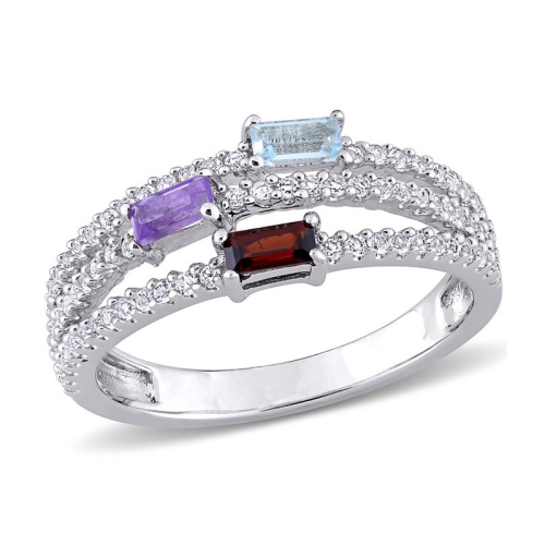 Make a celebrity like appearance at the next event with this opulent sky blue topaz, purple amethyst, rich red garnet and brillaint white topaz triple row ring. Crafted in shimmering sterling silver, this stylish ring features a sky blue topaz, an amethyst and a garnet baguette cut gemstones (4x2mm) and 73 round prong set white topaz gemstones (1x1 mm). Polished to a brilliant shine.