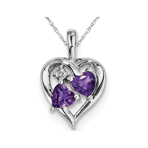 Two beautiful heart shaped purple amethyst gemstones sit in the warm embrace of sleek sterling silver in this heart pendant and matching silver chain. Amethyst is the birthstone of the month of February.
