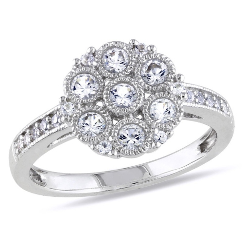 A unique cluster design gives this ring a lovely snowflake-style shape. Six prong-set, round-cut white sapphires serve as the focal point of this sparkly piece. Additional bezel-set stones bring a glistening look to the high-polish sterling silver setting. This ring is simple enough for everyday wear, yet offers enough glamour for a special night out.