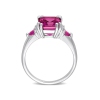 This exceptional three-stone ring is crafted in lustrous sterling silver and features an octagon-cut, prong-set pink topaz (10x8mm) adorned with trilliant-cut, two prong-set ruby (3x3mm) gemstones and eight round-cut, prong-set diamonds (G-H, I2; I3). Enhanced with a polished finish, this ring is a perfect statement piece for your next party.