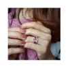 This Rose-de-France and African amethyst with lab-created white sapphire 3-stone halo ring is a true statement piece. Crafted in shimmering rose gold flash plated sterling silver, this stunning ring features a multi-prong set, octagon cut rose de France gemstone in the center (10x8mm) with two oval African amethyst gemstones around it. This whole crown is surrounded by round buttercup set lab-crea