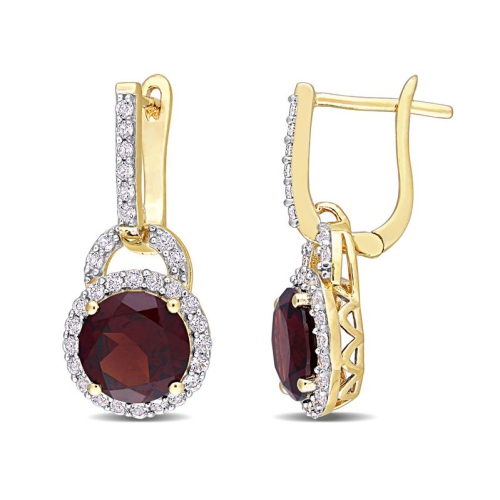 These amazing halo dangle earrings are crafted in lustrous yellow plated sterling silver. Each of these pleasant drop earrings feature a round cut, prong set garnet center stone surrounded by a halo of round cut white topaz gemstones. Enhanced with a high polish finish, these charming earrings are a valuable addition to any jewelry collection. Take your style to a new level with these fashionable
