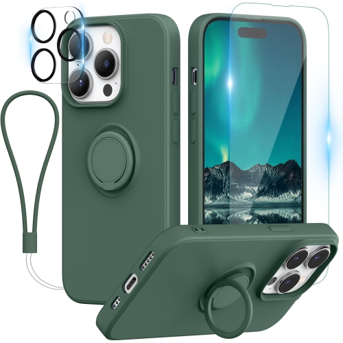 [4 in 1] Ring Holder Case for iPhone 14 Pro Case,with Screen Protector+Camera Lens Protector+Hand Strap,Silky
