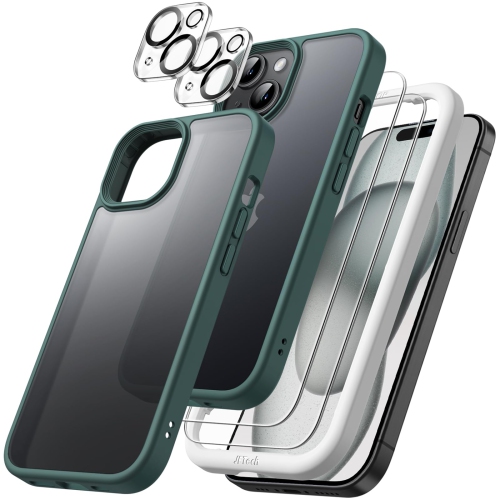 5 in 1 Matte Case for iPhone 15 Plus 6.7-Inch with 2-Pack Each Tempered Glass Screen Protector and Camera Lens Protector, Translucent Back Shockproof Phone Cover (Dark Green)