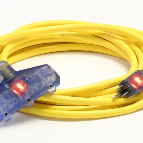 * This heavy-duty extension cord is highly visible on job sites and remains flexible to -40 degrees. It features molded-on 15 amp 125 volt NEMA 5-15 plugs and connectors, and LED power indicators. Its copper is soft drawn and annealed for maximum flexibility under full load.* 50' all-weather triple tap extension cord.* Remains flexible in low temperatures.* Resists oil and grease.* 12/3 SJTW. CAS