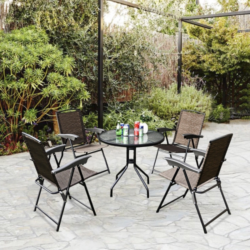 Enjoy outdoor leisure time with our beautiful practical 5pc bistro furniture set. Bistro sets are perfect for outdoor and indoor use. And it offers you a quiet, cozy space to host a conversations, read a book, enjoy morning coffee or whatever else you like. Lightweight and constructed of breathable fabric and durable steel, which ensure it can last throughout the seasons. Besides, the table with elegant glass top which ensures practical and decor.