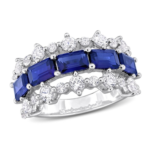 Embrace sophistication with this 6.65 (ctw) lab-created blue sapphire and lab-created white sapphire Ring. Created meticulously in sterling silver, this exquisite piece boasts a total gemstone weight of 6.65 carats (ctw). The ring showcases a captivating combination of emerald cut lab-created blue sapphires and round cut created white sapphires, arranged in a triple row design. Its stackable natur