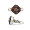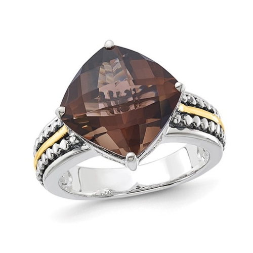 This glamorous ring has one large 6.80 carat (ctw) cushion-cut Smoky quartz prong set into antiqued sterling silver with 14 karat yellow gold accents completes the look of this juicy gemstone brown ring.