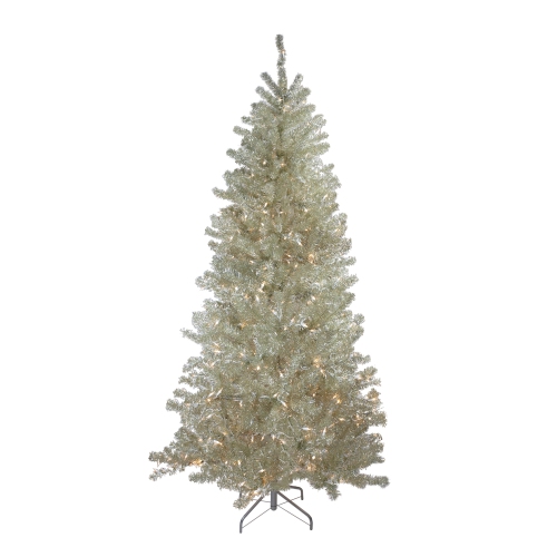 Champagne artificial tinsel Christmas tree. Bendable wire in the branches for easy positioning. 623 tips give it incredible fullness and body