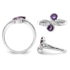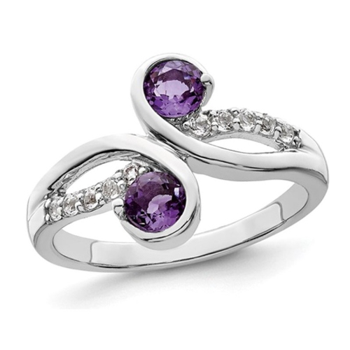 A Stunning swirl shaped ring with twin amethysts is matched to white topaz gems in this unique ring crafted from sleek sterling silver. This ring features the birthstone of February in a new special look.
