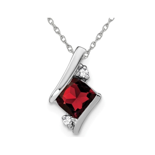 A beautiful cushion cut natural garnet .70 carats (ctw) sits in the warm embrace of 10 karat white gold in this special and unique pendant and matching 10 white gold chain. Beautiful sparkling accent diamonds complete the look.