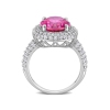 This oval pink topaz double halo cocktail ring is crafted in polished sterling silver and features an oval cut, prong set, pink topaz gemstone at the center with 94 round-cut, pave-set created white sapphires in a bold double halo design. Enhanced with a high polish finish.